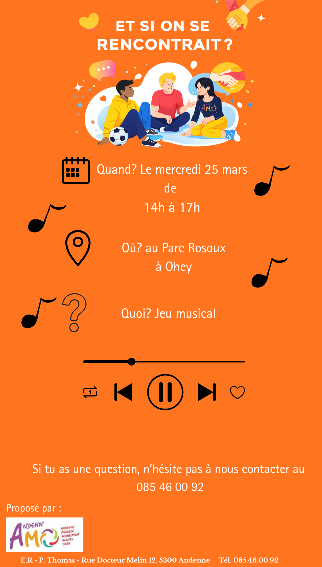 « Et si on se rencontrait ? ». Cela sera un jeu musical qui se déroulera le mercredi 25/03 au Parc Rosoux de 14h à 17h.