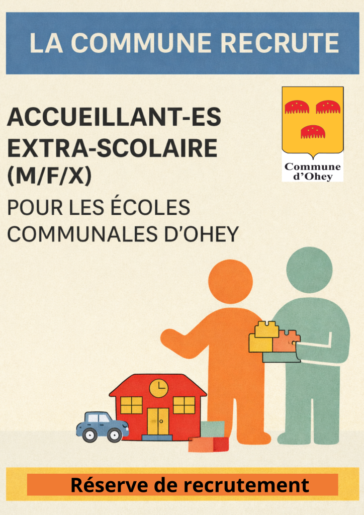 LA COMMUNE D’OHEY CONSTITUE UNE RÉSERVE DE RECRUTEMENT POUR DES FONCTIONS D’ACCUEILLANT-ES EXTRA-SCOLAIRE (M/F/X) POUR LES ÉCOLES COMMUNALES D’OHEY