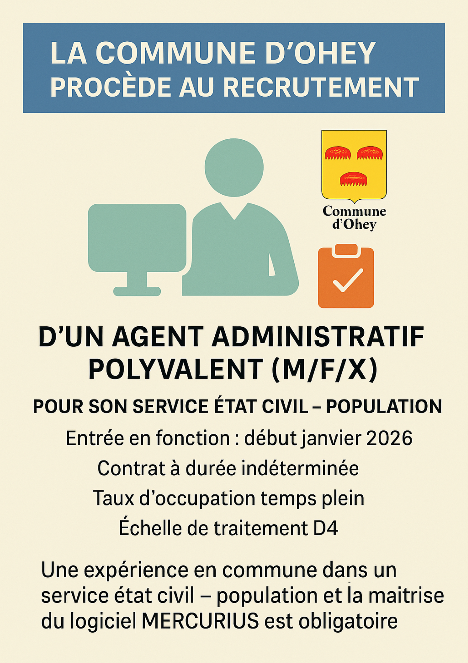 LA COMMUNE D’OHEY PROCÈDE AU RECRUTEMENT D’UN AGENT ADMINISTRATIF POLYVALENT (m/f/x) POUR SON SERVICE ETAT CIVIL POPULATION