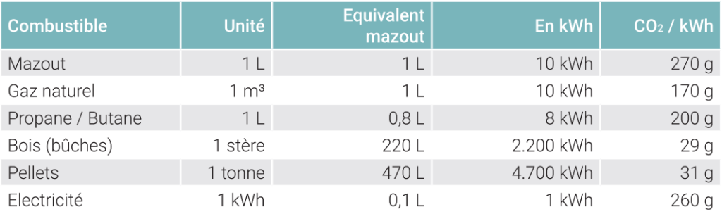 La consommation de chauffage peut, elle aussi, s’exprimer en kWh dans un rapport d’audit ou de P.E.B., mais usuellement elle s’exprime en litre de mazout, m3 de gaz, tonnes de pellets, etc. Pour une consommation annuelle de 2.000 L de mazout et 3.500 kWh d’électricité, la facture d’énergie d’un logement s’élève à 3.750 € en moyenne en Wallonie.