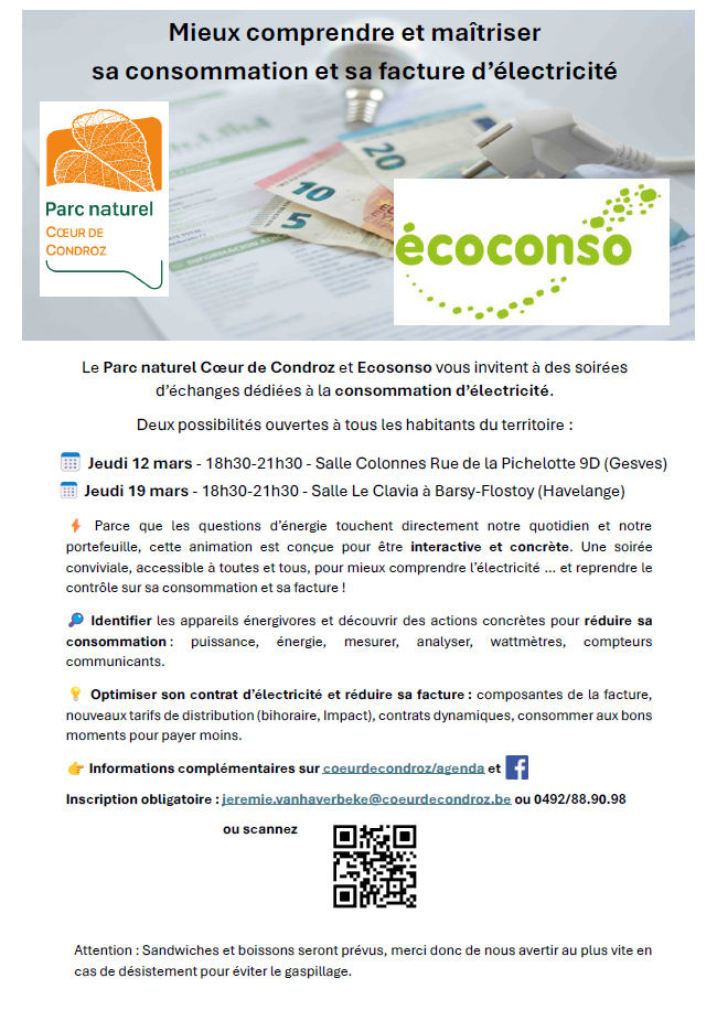 Le Parc naturel Cœur de Condroz et Ecosonso vous invitent à des soirées d’échanges dédiées à la consommation d’électricité.