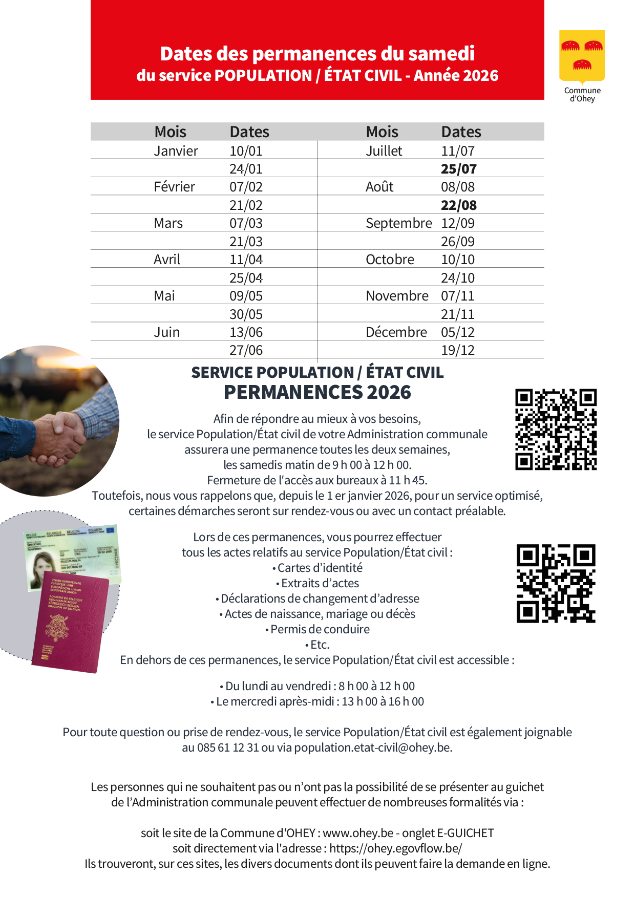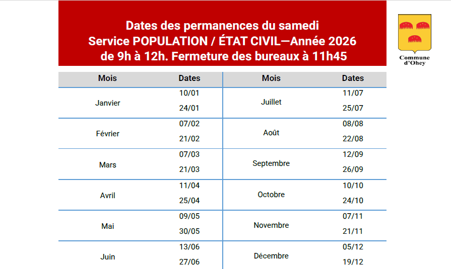 ou par mail : par mail : population.etat-civil@ohey.be afin de pouvoir répondre a votre demande du samedi.